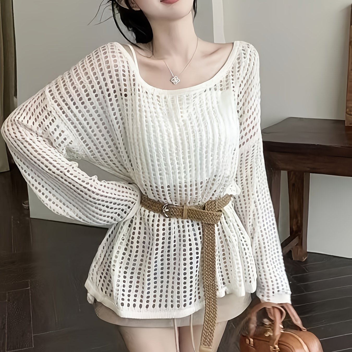TEMU 여성용 시크한 스웨터 - 라운드 넥 오픈워크 가디건, 봄/가을/여름용 경량 레이어링 피스, 사무실/파티/일상복 - 우아한 여성 의류, 스프링 패션, 오픈워크 디자인, 섬세한 디테일, 스타일리시 커버업, 패션 애호가를 위한