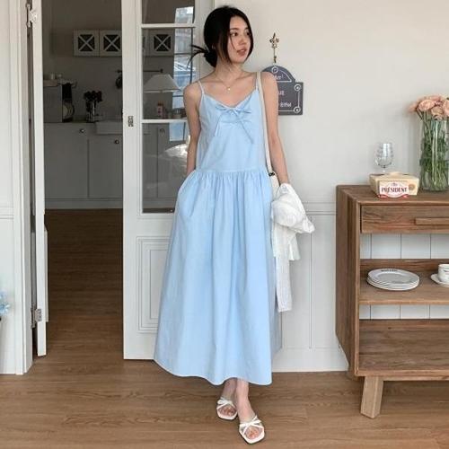 [신상오픈런]여성 슬림핏 롱드레스 어깨끈 허리주름 단색 디자인