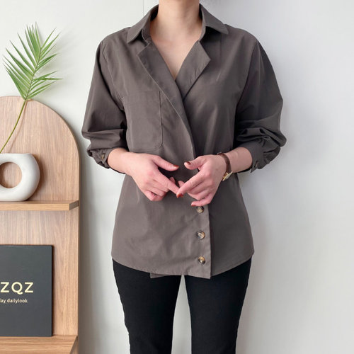 미즈큐즈 / 쓰리 버튼 백 셔링 주름 포인트 베이직 여성 간절기
