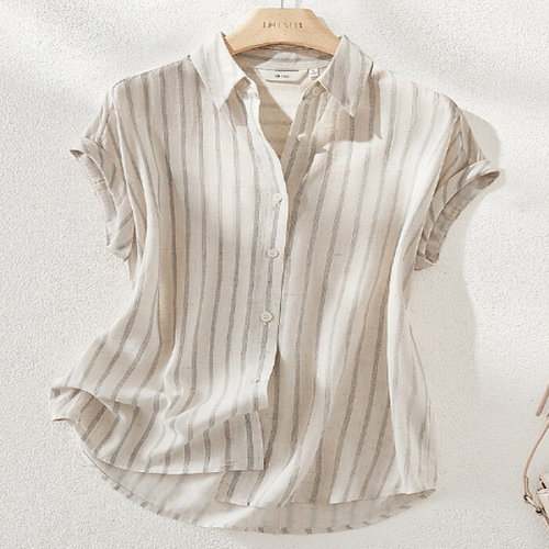 [미라클세븐]여성용 면 리넨 스트라이프 카라 반팔 블라우스