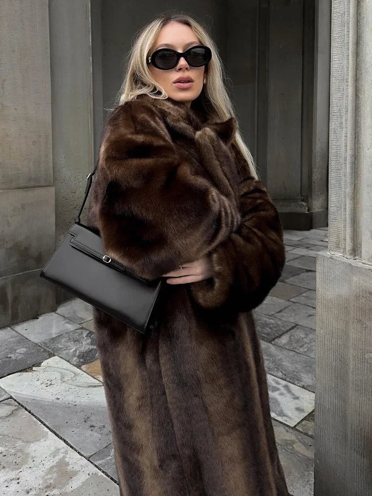 여성용 다크 다크 브라운 인조 모피 롱 오버코트, 싱글 브레스트 플리스 재킷, 트렌치 코트, 푹신한 플러시 따뜻한 코트, 2023 겨울 신상