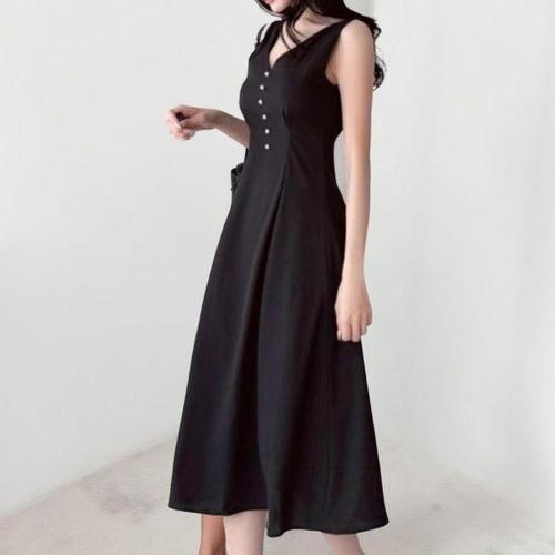 [신상오픈런]여성용 블랙 브이넥 민소매 롱 원피스 진주 버튼 클래식 디자인