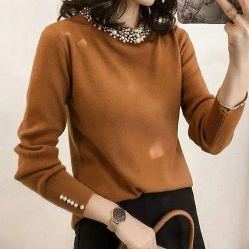 [에이치플러스몰]여성 가을 니트 라운드 봄 긴팔 진주 브라운 티 넥
