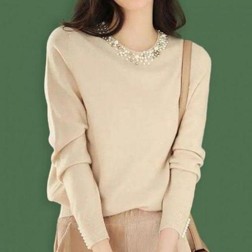 [에이치플러스몰]베이지 니트 넥 긴팔 라운드 가을 여성 티 진주 봄