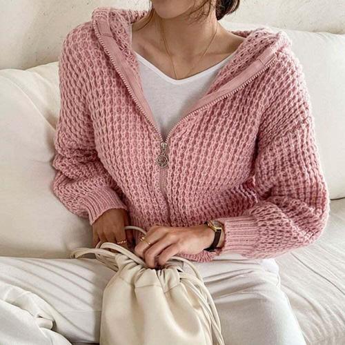 [셀럽하우스]니트 RBJN4154 크롭 가디건 와플 패턴 집업 여성 후드 아우터