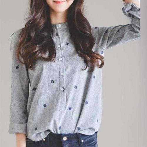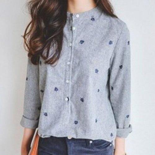 [신상오픈런]여성 유니크 리프 패턴 자수 차이나카라 스트라이프 셔츠