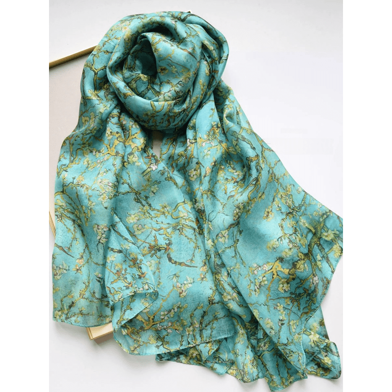 TEMU 100% 실크, 블루 반고프 알몬드 블라썸 오일 페인팅 실크 스카프, 가볍고 통기성이 좋으며 부드럽게 느껴지는, 예술적이고 고급스러운 완벽한 선물