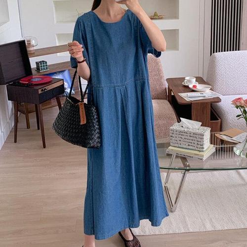 [옷자락]여성 대형 핀턱 반소매 뒷단추 청 임부 원피스 롱드레스