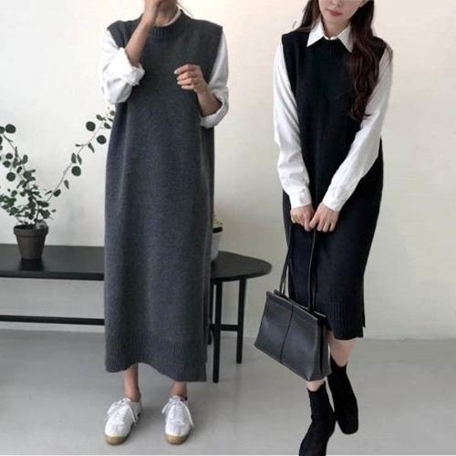 [엄지척]청순한 여자 무지 라운드넥 니트 롱 조끼 원피스_19862013_667501
