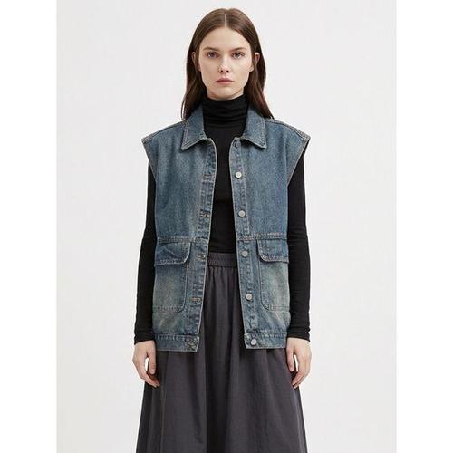 [샵앤]여성 카라넥 루즈핏 캐주얼 빈티지 데님 조끼 NARU-WVS-21049-진청