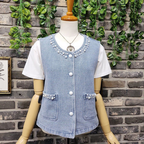 퐁당 / 진주 장식 라운드 노카라 청조끼