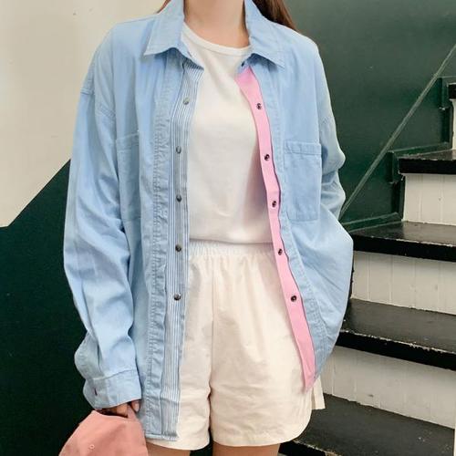 [다잇템]여자 연청남방 배색 테잎 오버핏 봄 셔츠