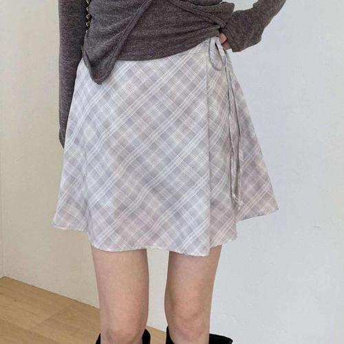 [옷자락] 여자 캐주얼 사선 체크 스트랩 플레어 미니 스커트