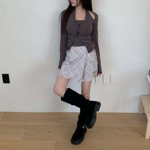 [신상오픈런]여성용 캐주얼 체크 패턴 스트랩 미니 플레어 스커트