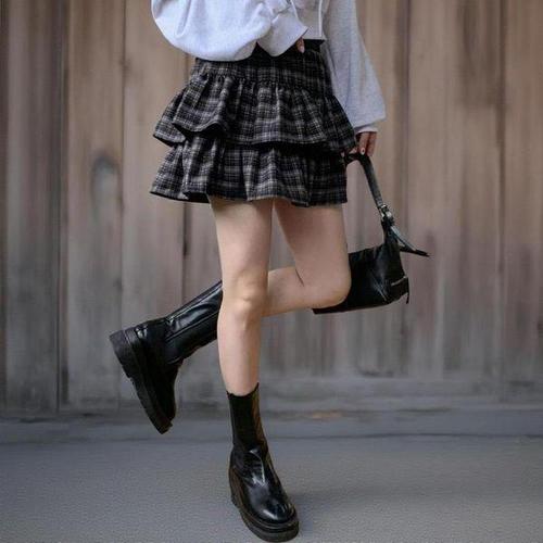 [신상오픈런]여성 체크 패턴 쉬폰 레이어드 미니 스커트