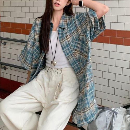 [에이치플러스몰]여자 청순 루즈핏 반팔 체크 패턴 셔츠 남방 2컬러