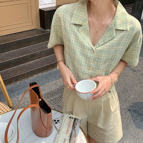 여성 여름 잠옷 반팔 체크 홈웨어 파자마 셔츠 실내복