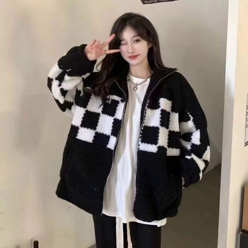 후드 간절기 체크 자켓 플리스 웜 여자 코트 EA (3yWZ5)