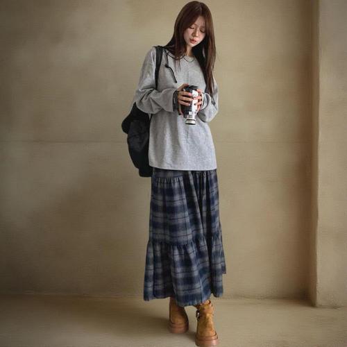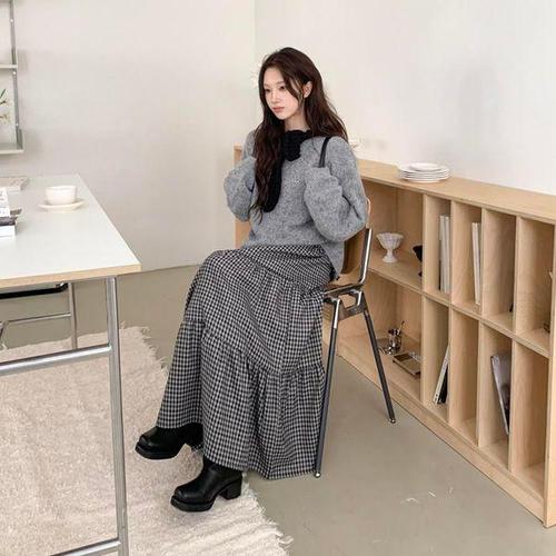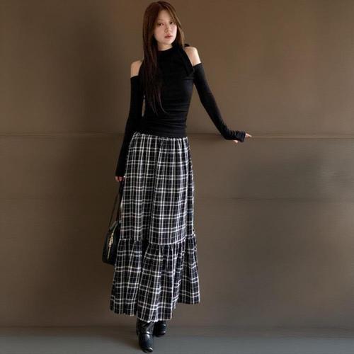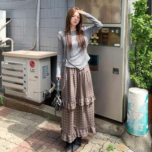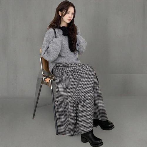 [신상오픈런]여성 체크 패턴 캉캉 롱 스커트 밴딩 디자인
