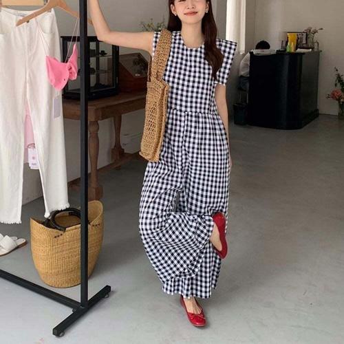 [셀럽하우스]체크 RRLI8904 라운드넥 와이드 팬츠 점프슈트
