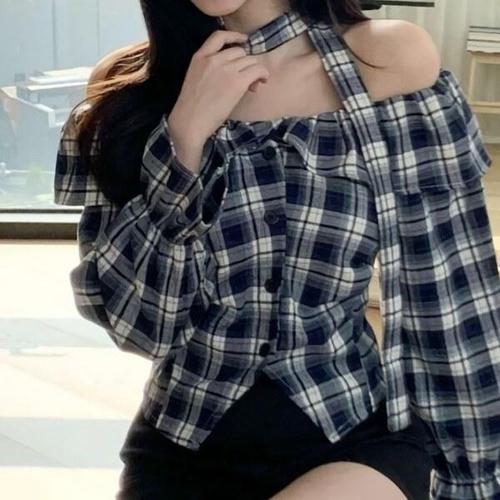 [신상오픈런]여성 체크 패턴 언발란스 오프숄더 블라우스 초커 스타일