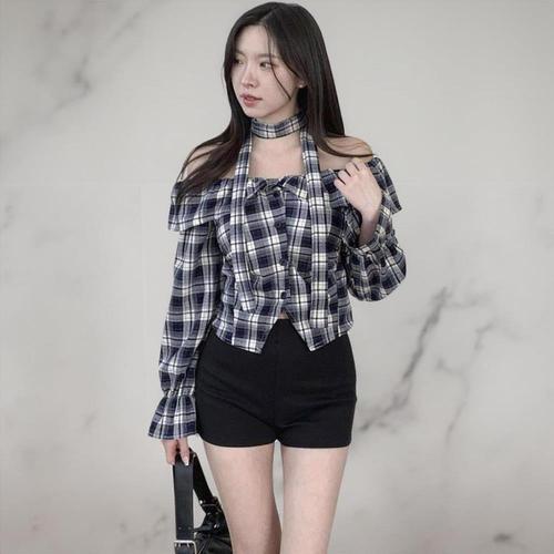 [디자이너몰]여성 초커 스트랩 오프숄더 체크 블라우스