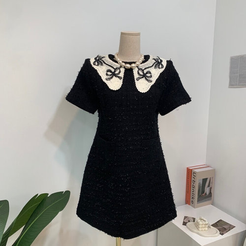 씨샵인더룸 / 포릴 트위드 수술 포켓 레이스 카라 리본 자수 반팔 원피스 one color C