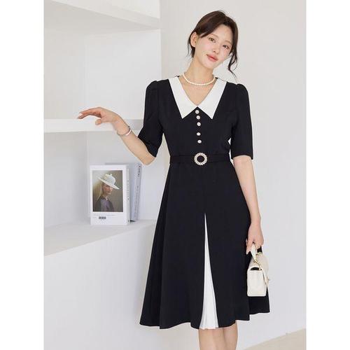 [모리스커밍홈]벨트세트 배색 카라 플리츠 하객 원피스_M2507OP061B