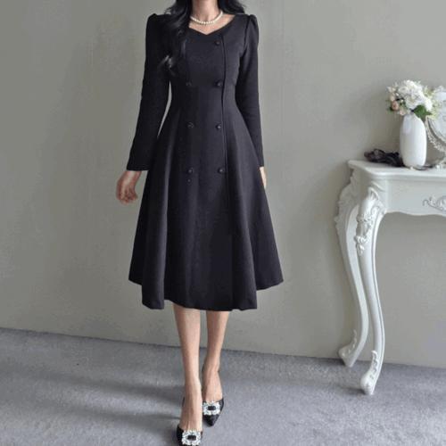 [엘린무드](롱) 홈즈 고퀄 트위드 더블버튼 노카라 A라인 하객 가을 원피스(2COLOR)