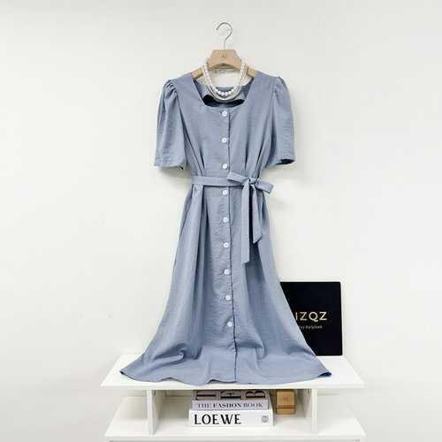미즈큐즈 / 스퀘어넥 버튼 퍼프소매 허리끈 핀턱 롱원피스 3컬러