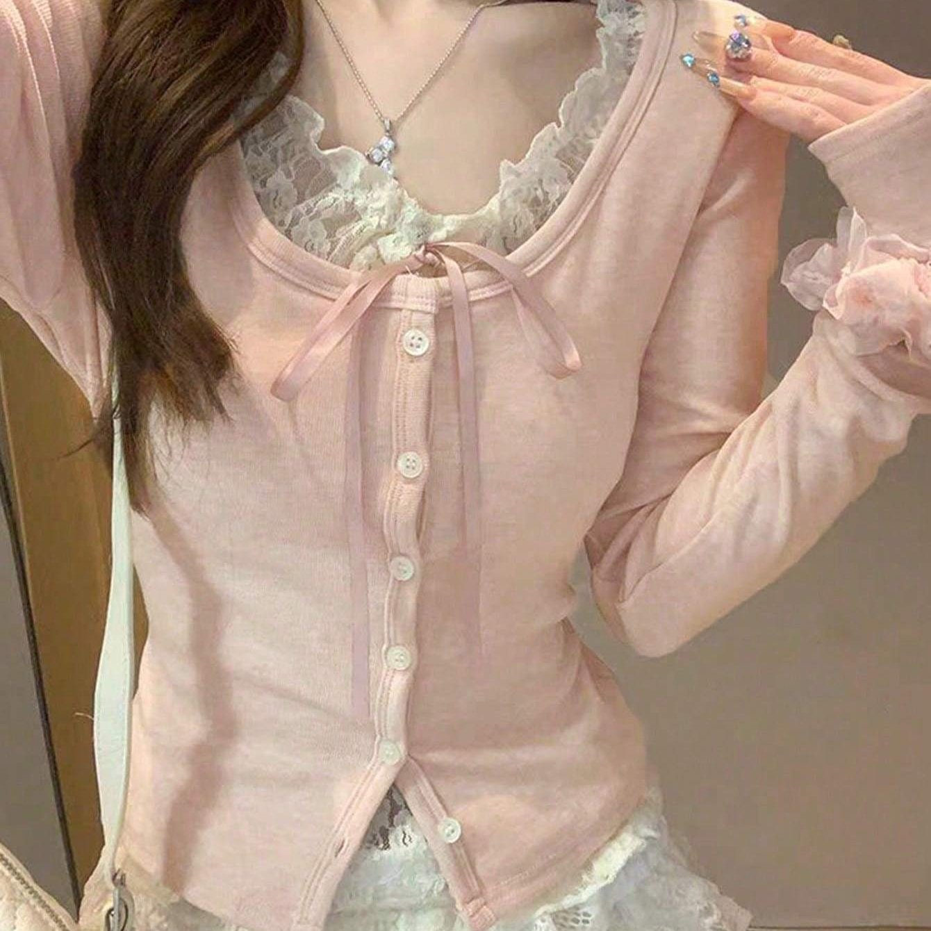 TEMU 봄 한국식 순면 레이스 컬러블록 버튼업 슬림핏 2-in-1 롱슬리브 베이스 레이어 티셔츠 탑