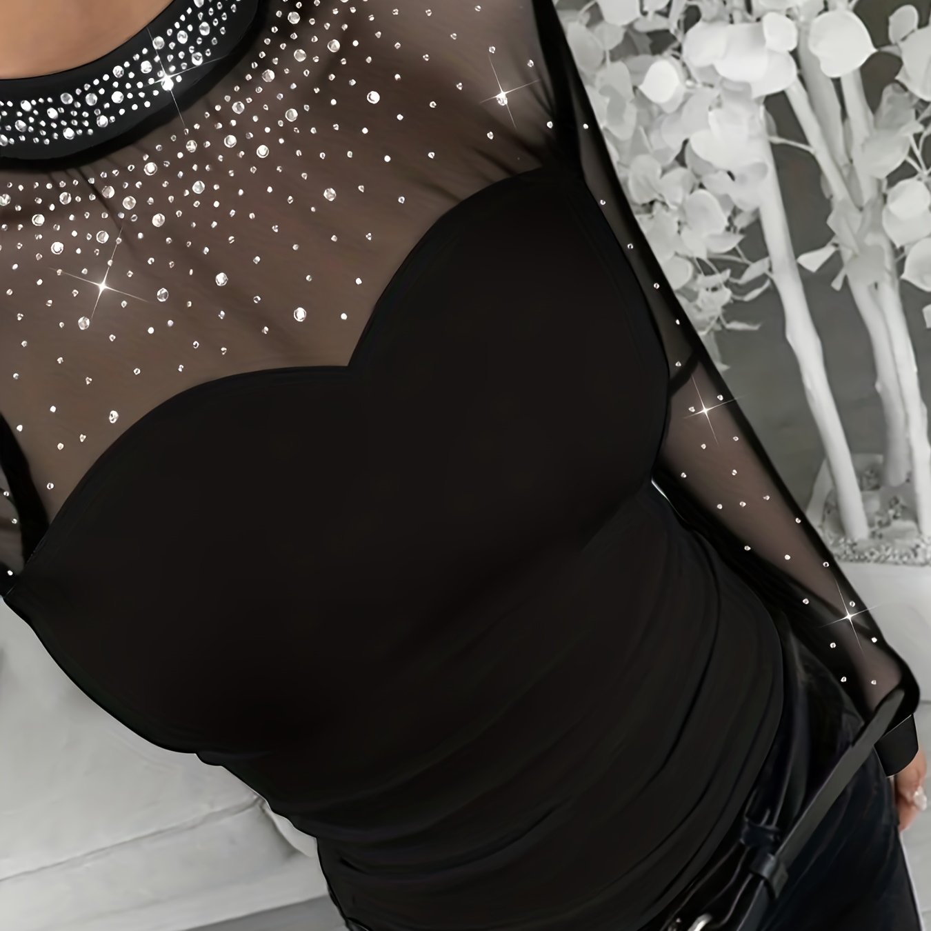 TEMU 패션 메쉬 패널 롱 슬리브 탑, 라인스톤 장식 | 단색, 올 시즌, 메쉬 디테일