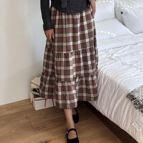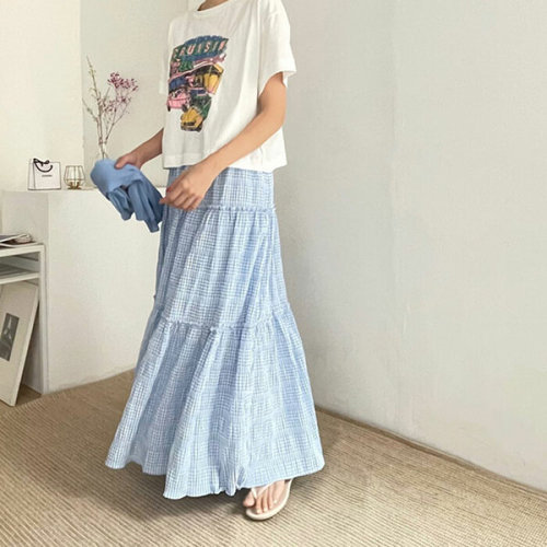 [에이치플러스몰]체크패턴 캉캉 플레어핏 심플 밴드라인롱스커트