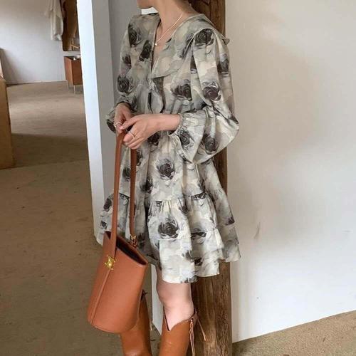 [셀럽하우스]잔꽃무늬 TTJC6698 패턴 셔링 캉캉 쉬폰 A라인 미니 원피스