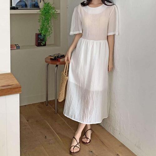 |KHO55D6|여성용 캐주얼 반팔 롱 쉬폰 원피스 시스루 핀턱 디자인