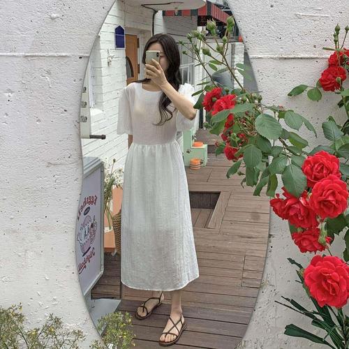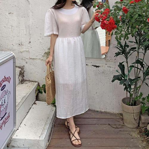 [옷자락] 여성 캐주얼 쉬폰 시스루 핀턱 반팔 롱 드레스