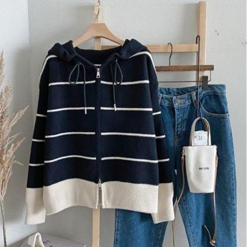 [옷자락]여성 캐주얼 스트라이프 후드집업 가디건