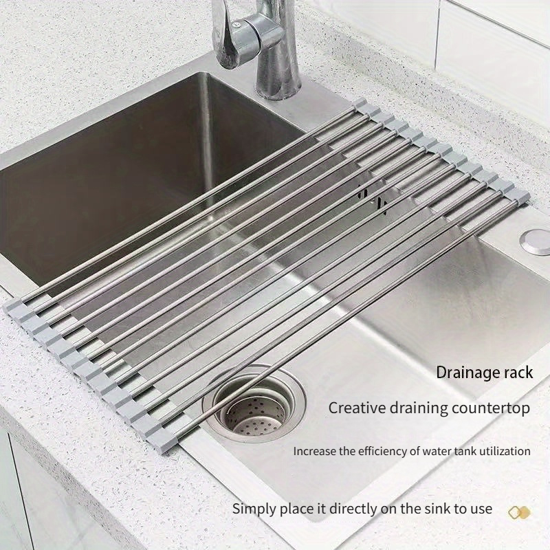 TEMU 스테인리스 스틸 싱크대 위 식기 건조대, 접이식 및 롤업 가능, 가정용으로 적합한 다기능 휴대용 식기 건조대 도구, 물기 제거 랙 및 커트러리 보관 랙|식기건조대|식기건조기