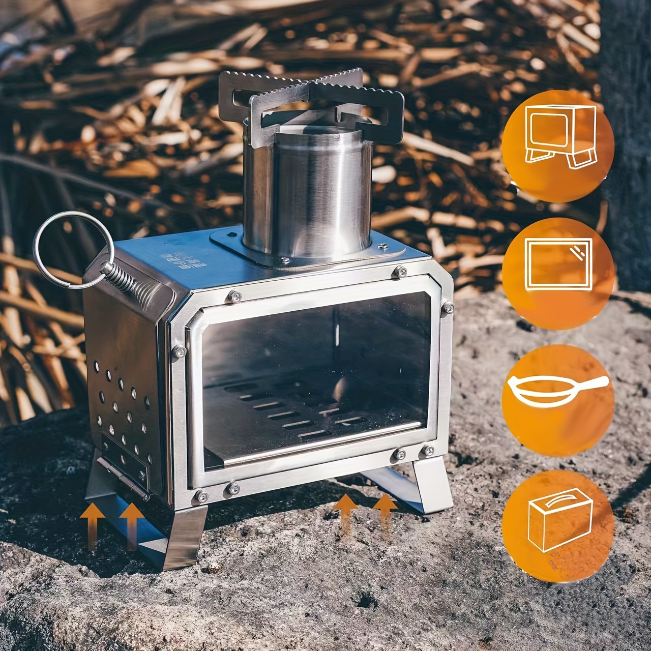 TEMU 휴대용 데스크탑 나무 연소 스토브 (야외 캠핑 및 피크닉용) | 고온 저항 C, 미세 결정 유리 관찰 창, 분리형 유리로 간편한 청소, 201 스테인리스 스틸