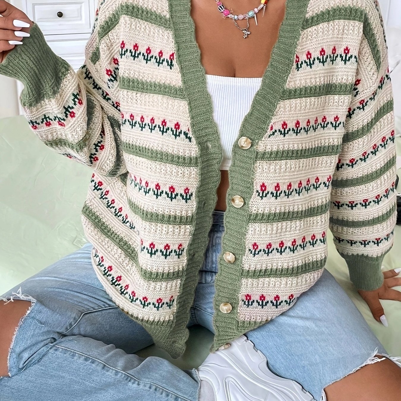 TEMU 플러스 사이즈 - 여성용 우아한 꽃무늬 프린트 V넥 카디건, 프릴 하단 및 긴 소매 - 베이지, 녹색, 빨간색 및 흰색 디티 꽃무늬, 버튼업 프론트, 가을/겨울 따뜻한 레이어링 피스, 가을 겨울 착용 | V넥 카디건 | 프릴 하단 카디건, 카디건 스웨터
