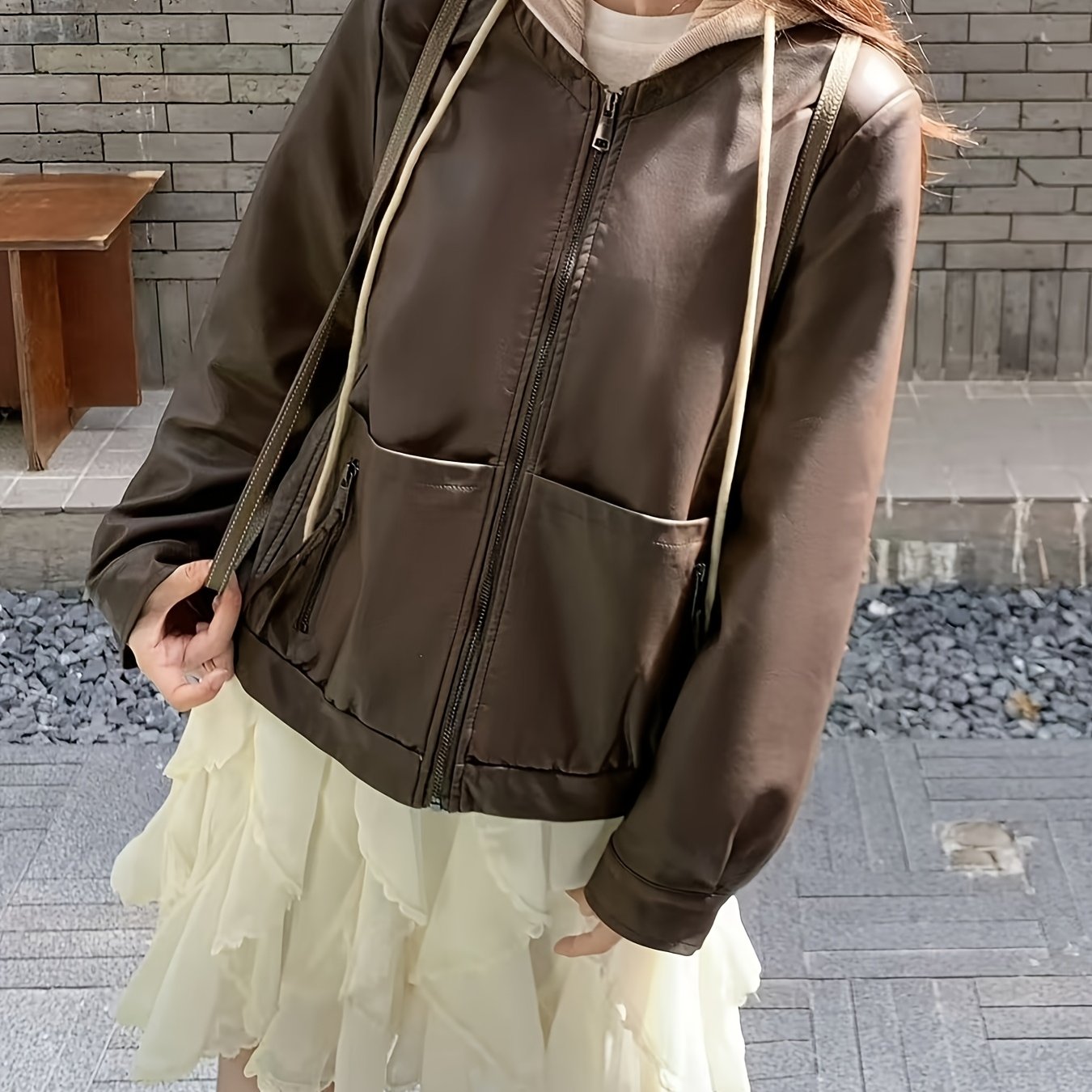 TEMU 봄가을 여성용 멀티핏 후드 PU 가죽 자켓, 심플 루즈핏 지퍼 커뮤터 캐주얼 PU 가죽 자켓