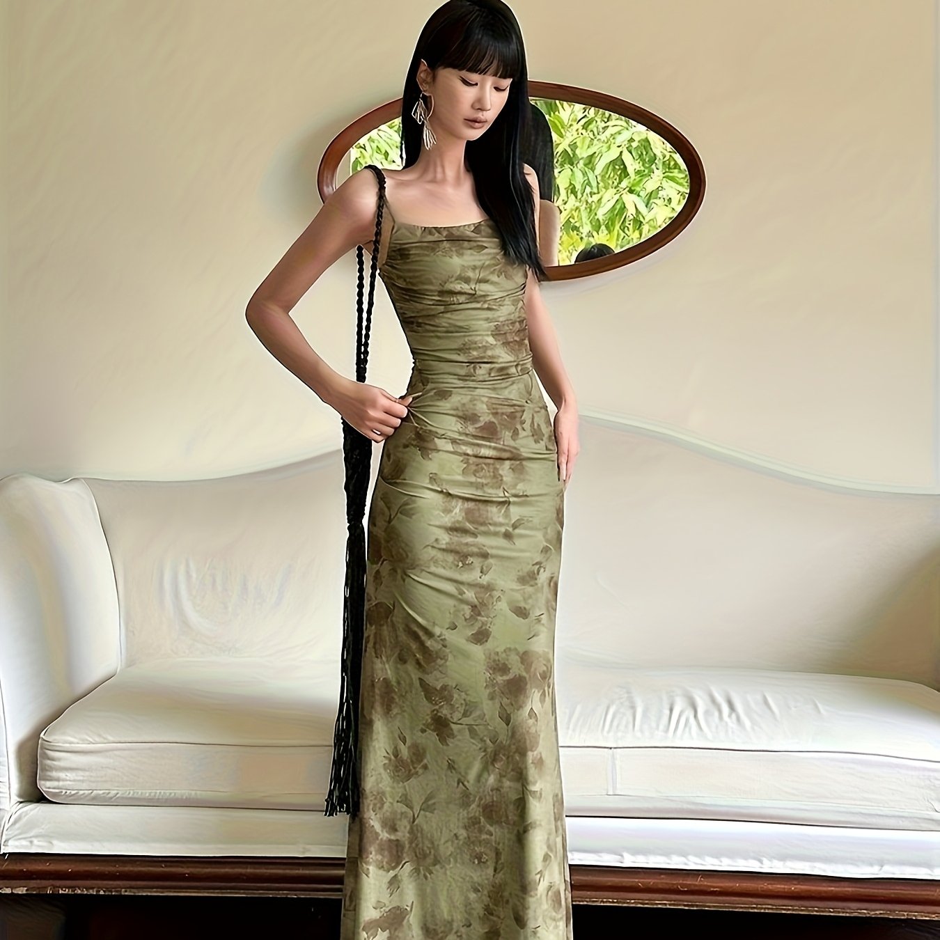TEMU 여성용 신상 중국풍 그린 메쉬 플로럴 멜빵 드레스 - 여름 디자인 고급스러운 웨이스트 힙 피쉬테일 롱 스커트
