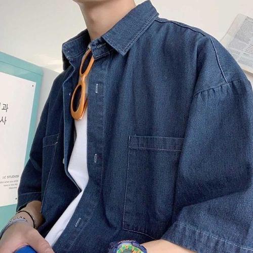 [에이치플러스몰]남자 데이트 룩 여름 코디 진청 데님 반팔 셔츠 코디