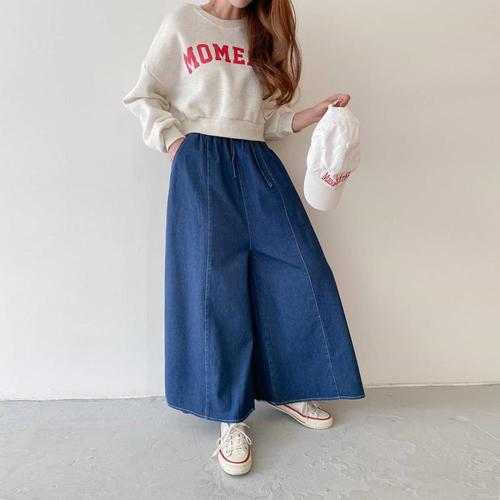 [미라클세븐]여성용 코튼 와이드 롱 데님 팬츠 허리 스트랩 디자인