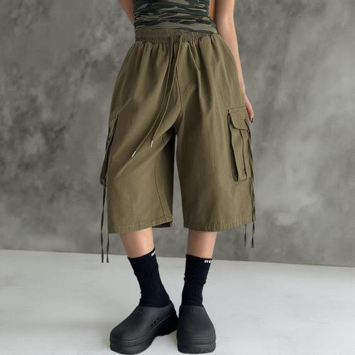 [옷자락]여성 카고 반바지 스트랩 8부 와이드핏 밴딩 면 팬츠