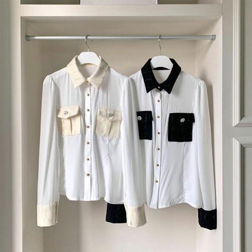 [다잇템]여성 카라넥 두 콩단추 주머니 시폰 블라우스