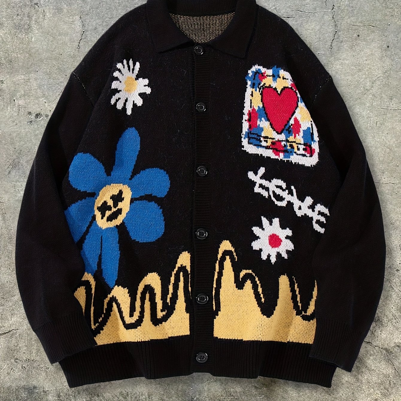 TEMU 남성 캐주얼 V넥 긴팔 가디건 | 귀여운 플로럴 및 하트 패턴 니트 원단, 버튼 플래킷, 가을/겨울 시즌|가디건