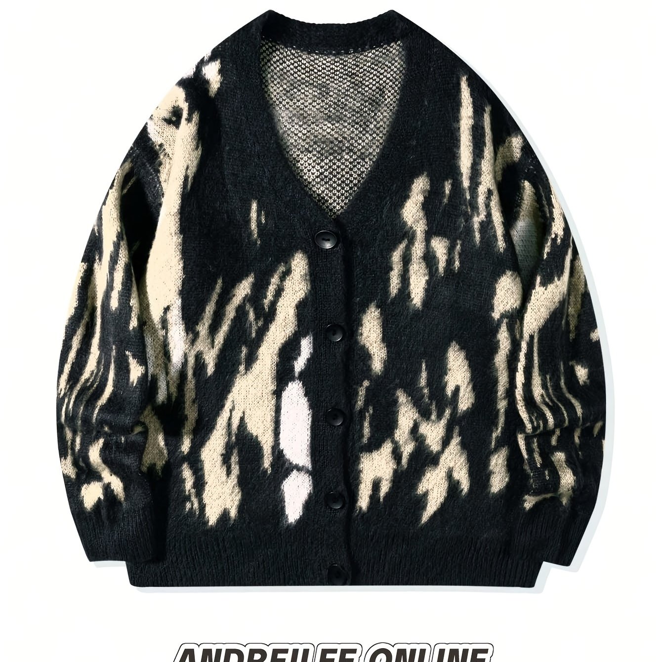 TEMU 가을/겨울 신상 남성 스트리트 캐주얼 패션 힙합 트렌드 긴팔 패브릭 V넥 재킷 버튼업 비정형 패턴 빈티지 니트 가디건 아우터웨어