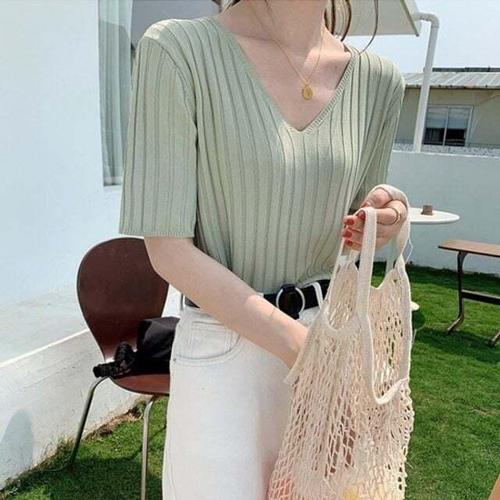 [셀럽하우스]쿨 NFQE0166 니트 브이넥 반팔티 HH-D42