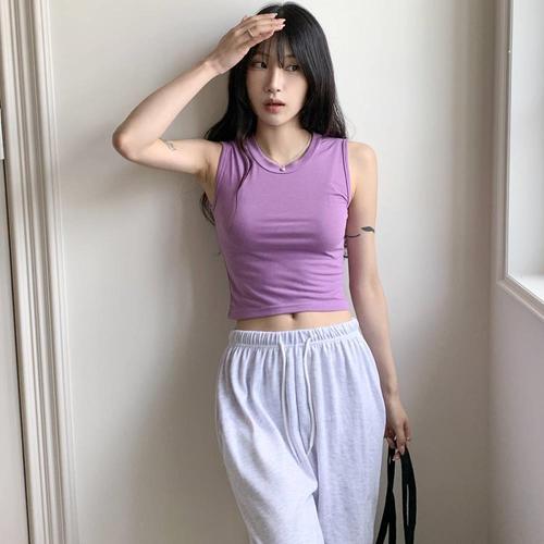 [옷자락] 여성 무지 컬러 면혼방 크롭 민소매 티셔츠
